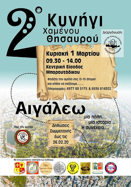 Ο Σύλλογος Κρητών Αιγάλεω, υπό την αιγίδα του Δήμου Αιγάλεω, με τη συμμετοχή και υποστήριξη, του 2ου Συστήματος Προσκόπων Αιγάλεω, του Συλλόγου "Φίλοι του Πυριτιδοποιείου", του Συλλόγου Μικρασιατών Αιγάλεω "Νέες Κυδωνίες", της Πανελλήνιας Ένωσης Ασσυρίων, του Συλλόγου Ποντίων "Αξέχαστες Πατρίδες", του Συλλόγου Ποντίων Αιγάλεω "Ο Καύκασος", της Ένωσης Συλλόγων Γονέων και Κηδεμόνων Αιγάλεω και της Επίλεκτης Ομάδας Ειδικών Αποστολών Αιγάλεω, διοργανώνει το 2ο Κυνήγι του Χαμένου Θησαυρού, με θέμα: "Αιγάλεω, μία πόλη μια ιστορία .... η συνέχεια".